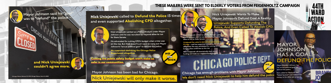 Back to the primaries. For all the money and institutional power that they have on their side, they barely eked out a temporary reprieve, while showing the ugly side of their so-called family. The attack ads and mailers (so many mailers!!!) that appeared to be specifically targeting older voters, that Sen. Feigenholtz campaign ran against Nick Uniejewski in the IL SD6 race, insinuated that the police is already defunded by the dynamic duo of Nick and Mayor Johnson(/S), even though they couldn’t find a single picture of them together and had to use bad photoshop to distort their appearance. There is so much going on here. We’ll let the unadulterated hate and fear-mongering in these mailers speak for themselves.