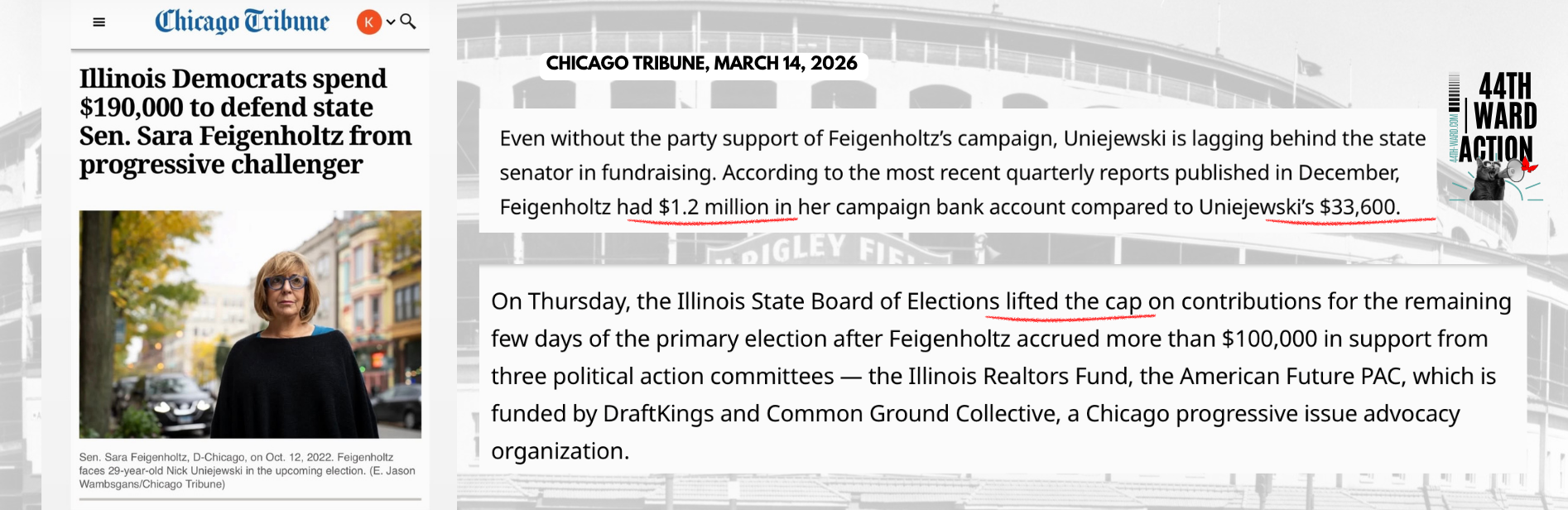 In spite of all this ugliness, the incumbent came in neck to neck on her home turf in our ward (49.99% and 50.01%), even though Nick’s campaign had $85,302 less than 4% of the total fundraising for this contest, compared to the incumbent Sen. Feigenholtz $2.199,332 according to Illinois Sunshine as of this morning (3/23/26). Nick and his team of volunteers did 12 times the work to overcome the difference in fundraising, not to mention other means of the entrenched institutional power, such as 44th ward democrats “family” endorsements. Similar picture is emerging for most of our progressive candidates who got significant votes % with a tiny fraction of the fundraising and no institutional power: